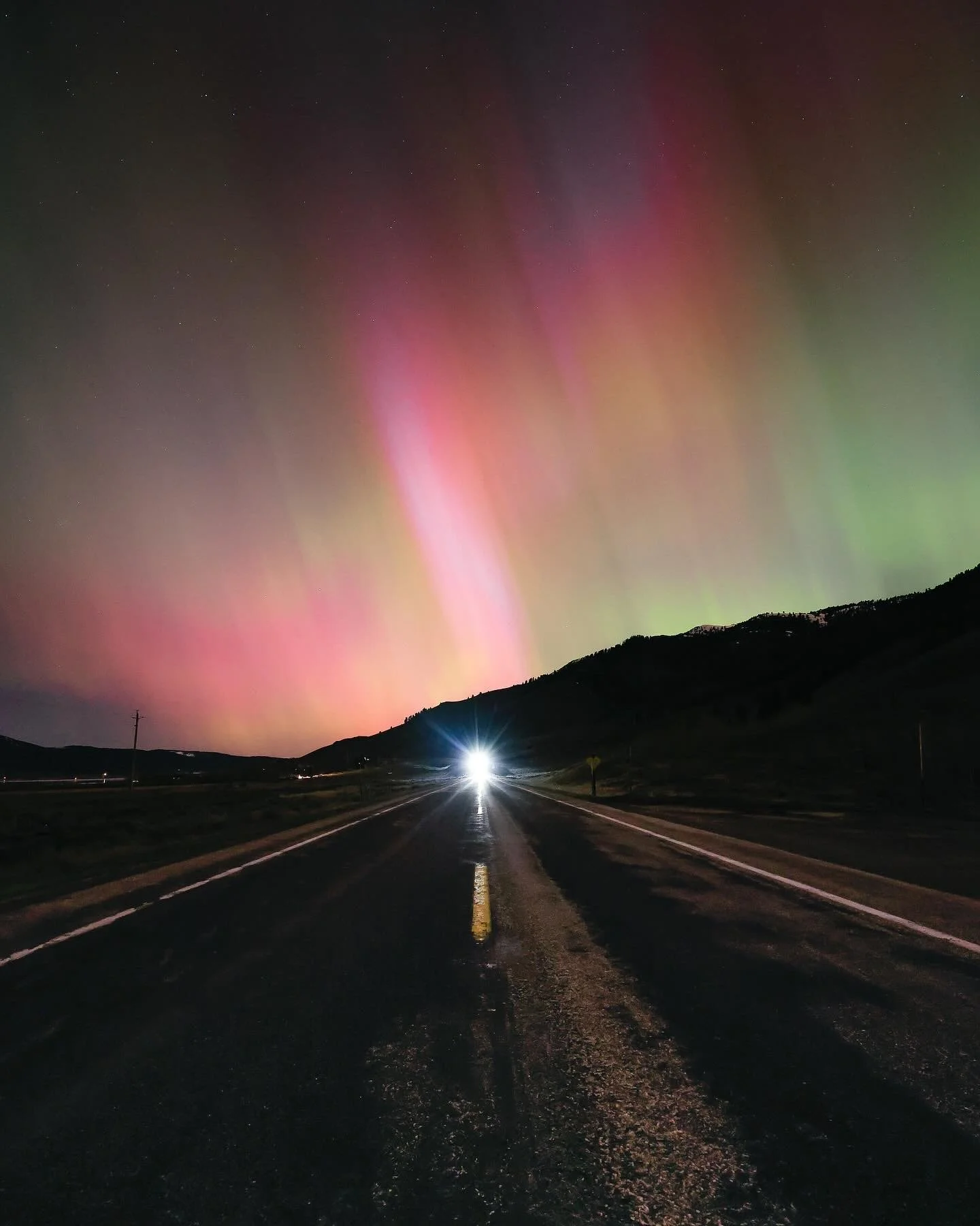 Both the sun and moon sank below the horizon, leaving us with the stars and the faint aurora to the north. A group of friends and I were making the drive back home at 2 AM through the dark, open roads of southwestern Montana. We had spent the last few hours waiting for a solar storm to reveal the Northern Lights (Aurora Borealis) between the dim hours of May 10 and 11, with just a hazy, faint glow to the north behind the mountains. It more closely resembled city lights.