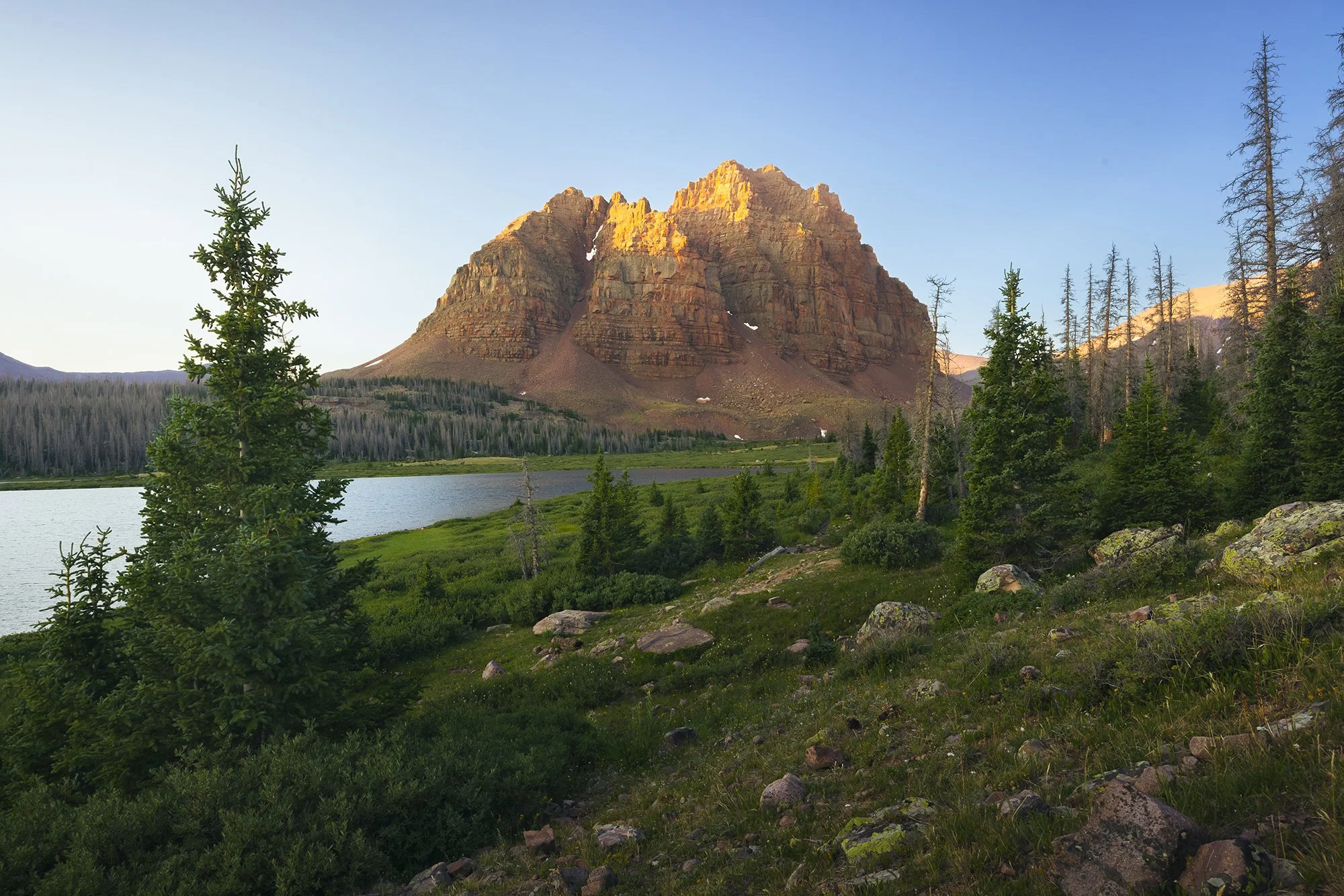 The Uinta Mountains stretch 150 miles from Kamas, Utah, to Cross Mountain, Colorado. One particularly striking and aptly named peak, Red Castle, stands tall beside its lower lake companion.